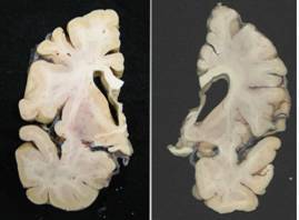 The picture on the left is normal; that on the right is from a patient with Huntington’s disease, showing the flattened caudate nucleus.