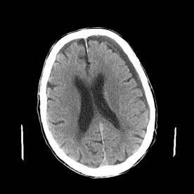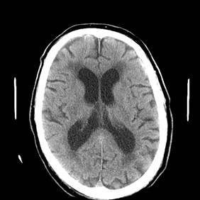 Head CT in a patient with normal pressure hydrocephalus. Note the dilated ventricles, out of proportion to the degree of involutional changes or cortical atrophy.