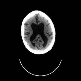 Non-contrast CT head in a patient multi-infarct dementia. Note the areas of lower density adjacent to the anterior and posterior horns of the lateral ventricles, due to chronic ischaemia.