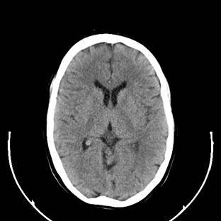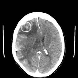 Head CT with contrast of a patient with metastatic breast carcinoma: note the ring-enhancing lesion and surrounding oedema causing a mass effect and some midline shift.