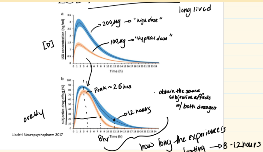 What are the typical routes of administration and timecourse for LSD and DMT?
