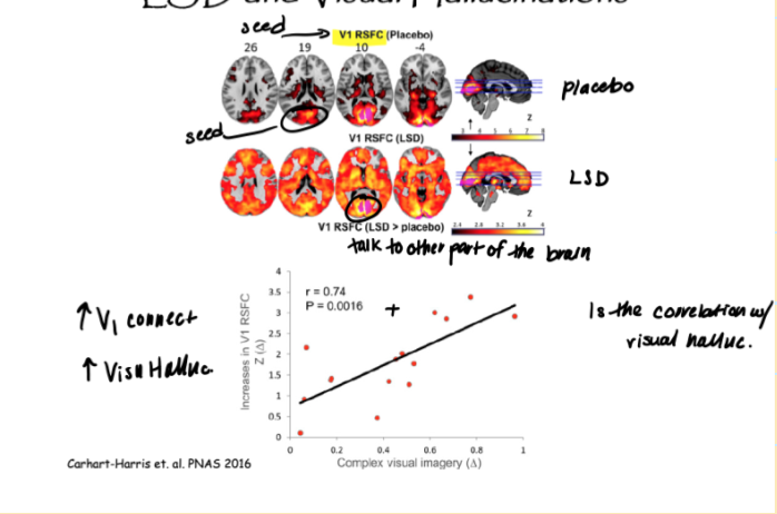 Give a patient a placebo and LSD and they found that the V1 connects increases when the increase of visual hallucination.