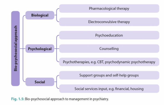 When managing pts in psychiatry you should use the biopsychosocial model; state some of examples of: