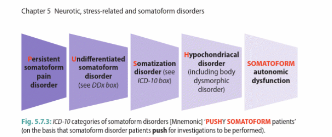 ICD-10 categorises somatoform disorders into 5 categories; state these