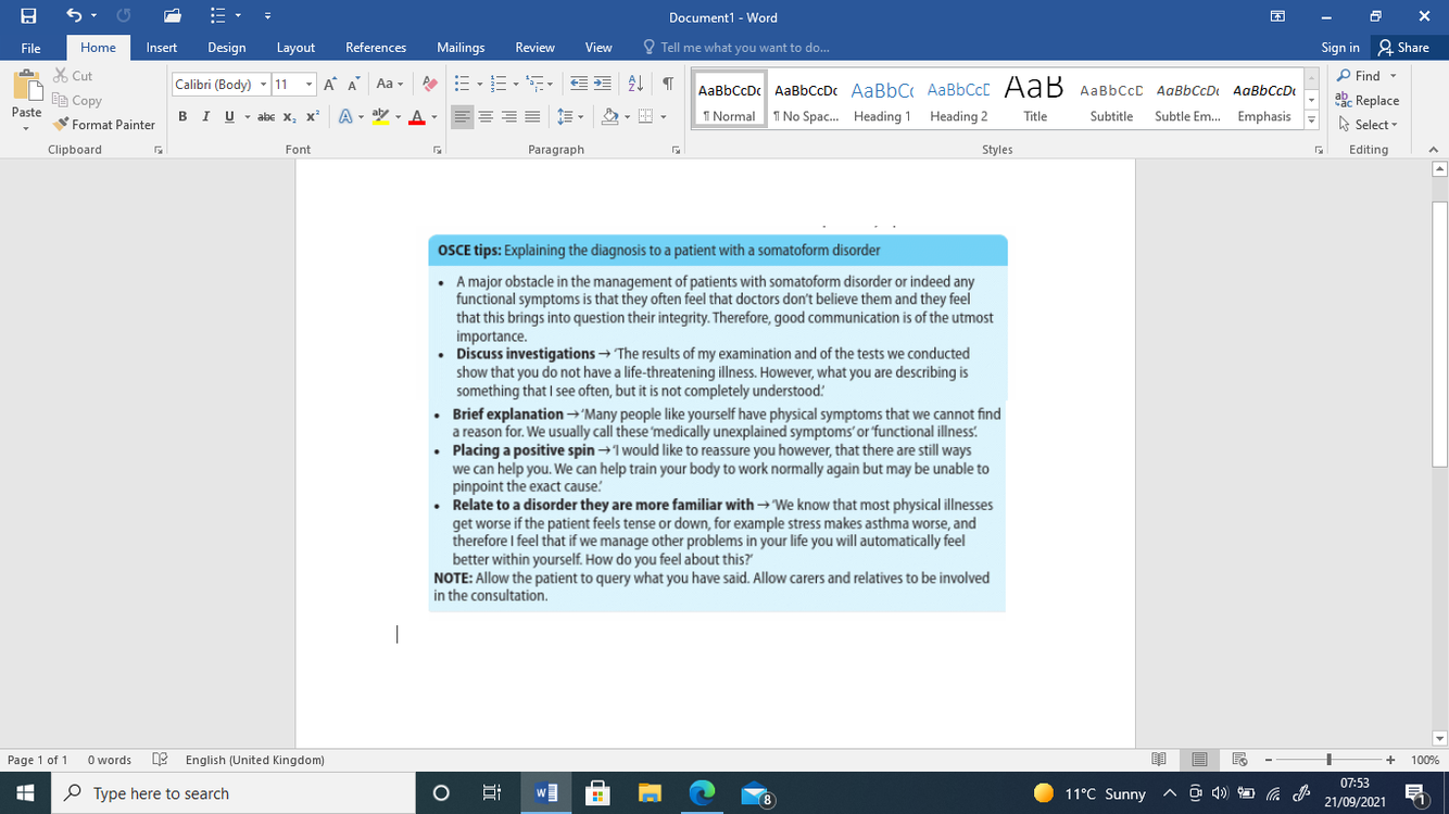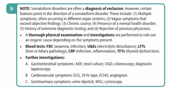 State some examples of investigations you would have to do BEFORE you could diagnose somatoform disorders