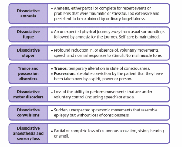 ICD-10 has 7 different types of dissociative disorder; state and briefly describe each of these