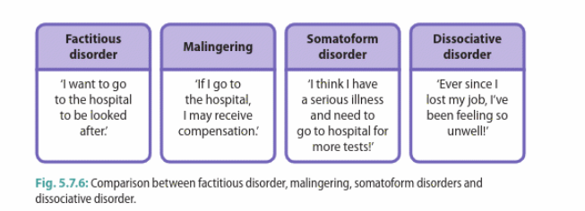 Examples to help differentiate between factitious, malingering, somatoform and dissociative disorders