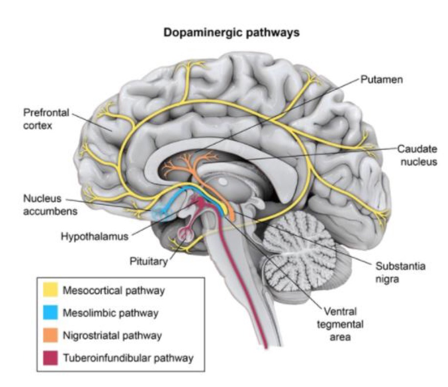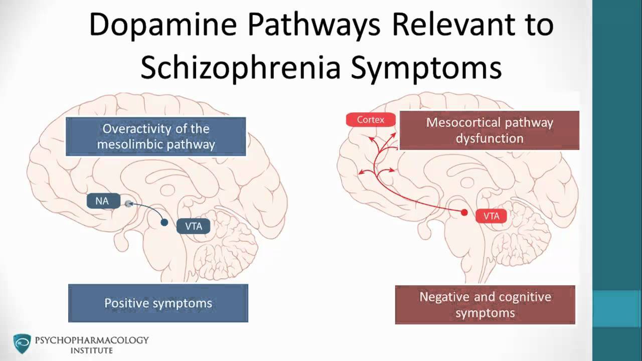 Mesocortical: thought to be underactive in schizophrenia (responsible for negative symptoms)