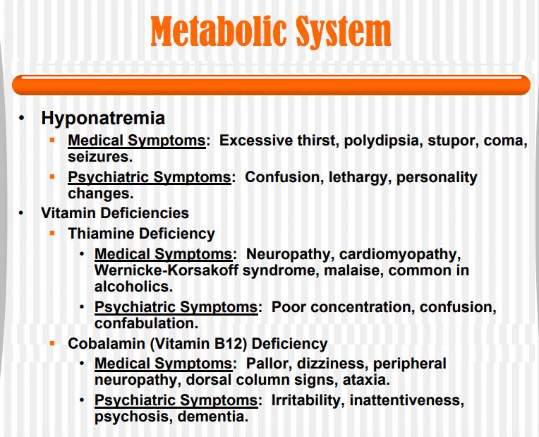 Confusion, lethargy, personality changes (Delirium)