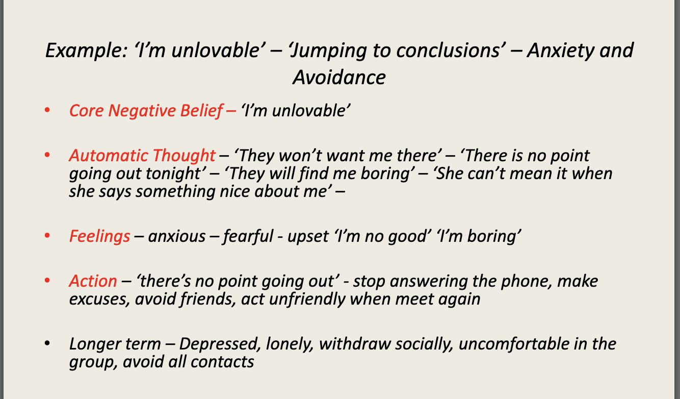 example: im unlovable - jumping to conclusions - anxiety and avoidance