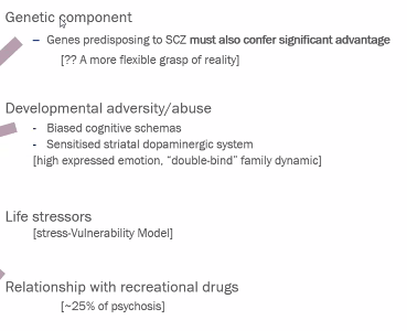 Genetic factors and environmental factors likely lead to abberant brain development which predisposes to psychosis