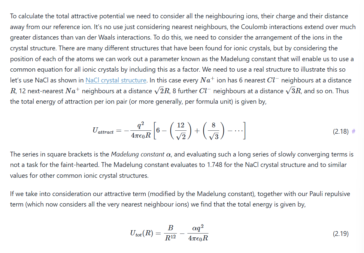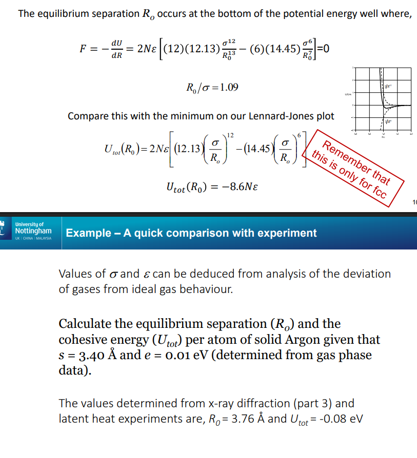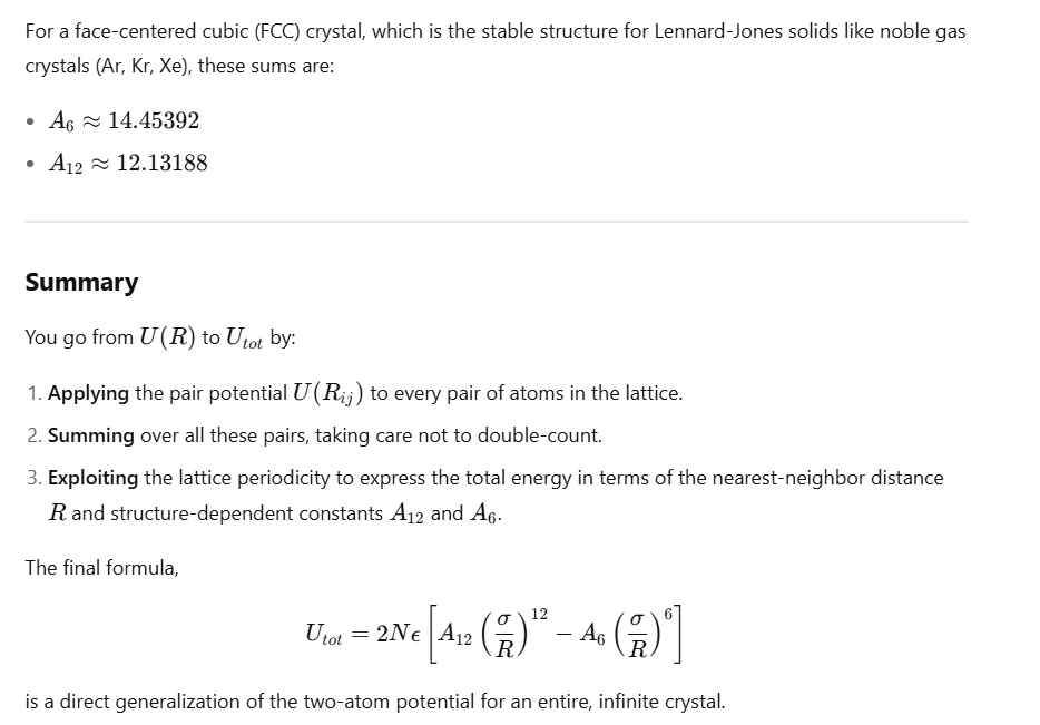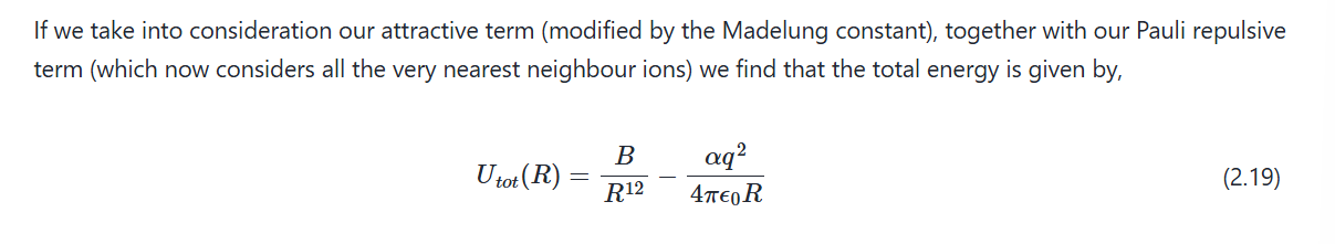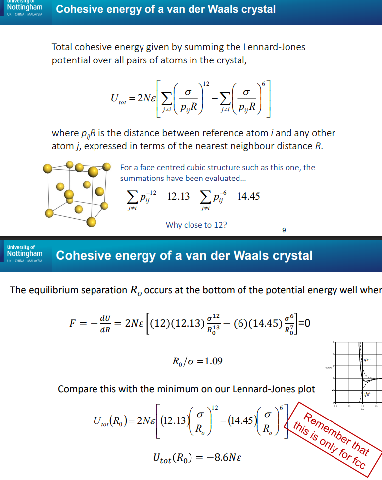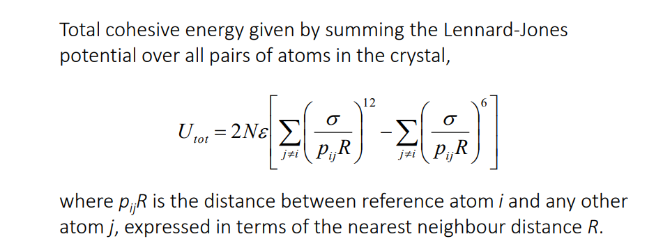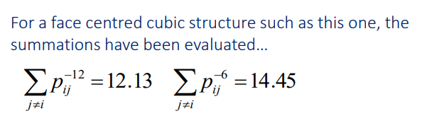 When going from 2 to multiple (a crystal of atoms)- The repulsive force each atom feels is a force from 12.13 atoms/nearest neighbours, and the attractice force is as though an atom is in an environment of effectively 14.45 neighbouring atoms.