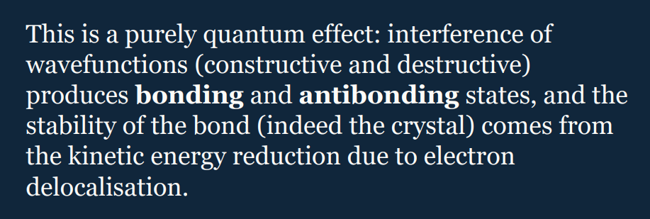 Covalent interactions arise from the constructive or destructive interference of neighbouring orbital wave functions- new molecular orbits emerge (LCAO)