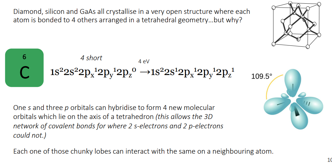 Explain how Carbon in Diamond hybridises to form sp3 molecular orbits/ tetrahedral structure.