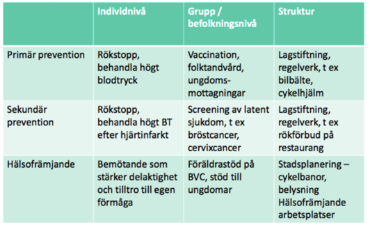 ge exempel på primär prevention på alla nivåer