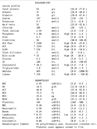History — Sam is an 11-year-old, 30kg, Labrador with a history of PU/PD for some years. He first became PU/PD around 3 years ago. — The clinical signs persisted for a further 8 months. — A further 3 months elapsed before Sam developed bald patches over his flanks and dorsum. These were non-pruritic and the hair was easily epilated. — A further 9 months elapsed and the owner brought Sam for vaccination having reported that the PU/PD had improved slightly. Unfortunately he had developed moderate left forelimb lameness.