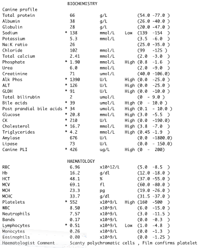On DDx was liver disease and liver values are up here however in HyperAC you get a metbaollic hepatopathy. Glucocorticoid induced ALP enzyme. This is not an uncommon picture for a cushinoid dog.