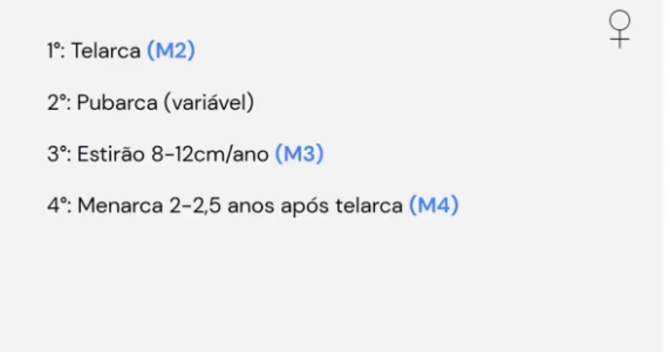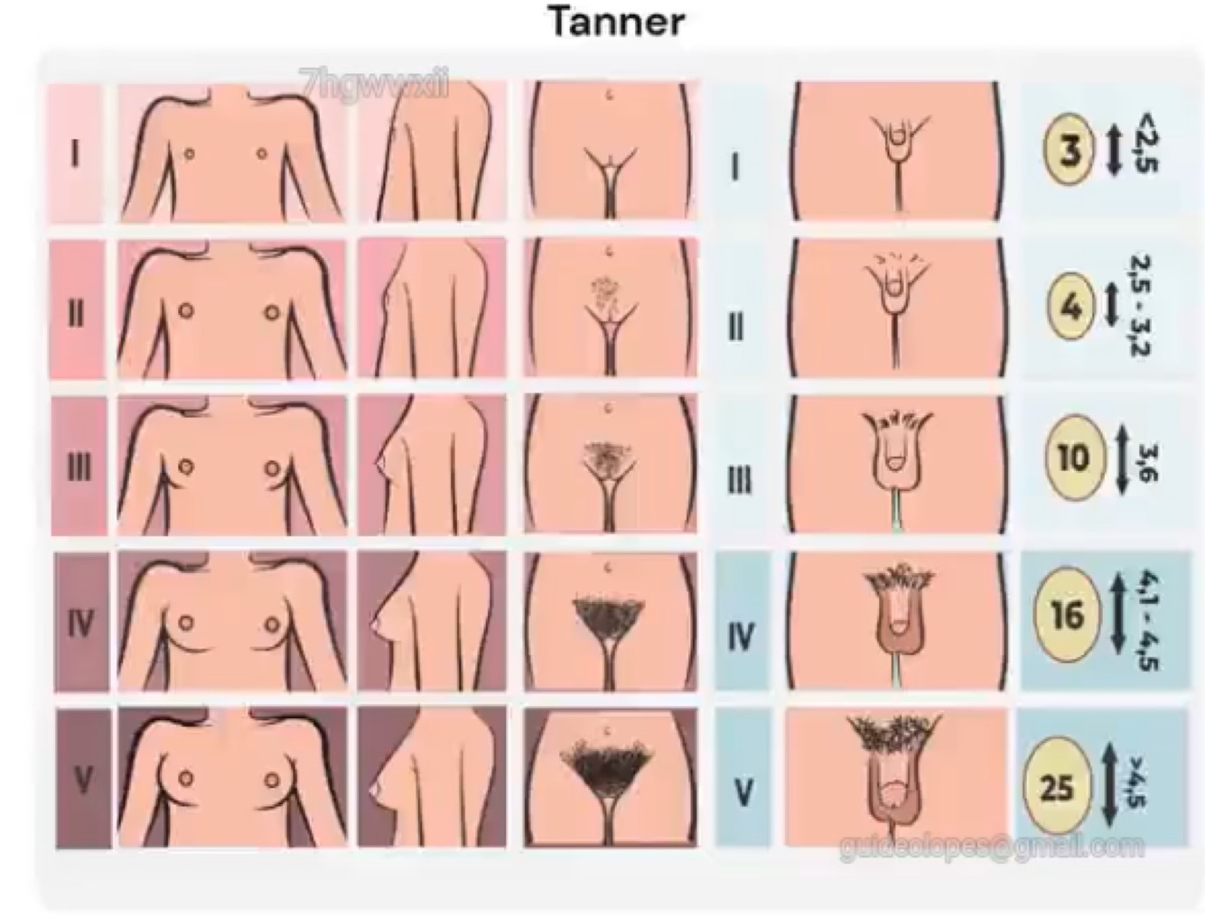 Quando ocorre a telarca, a pubarca, a menarca e o estirão na menina, de acordo com Tanner?