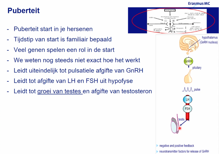 Door LHRH (GnRH) test kan je onderscheid maken tussen centraal en perifeer. Bij centrale puberteit leidt toediening tot hoge LH en FSH spiegels, bij perifeer niet.