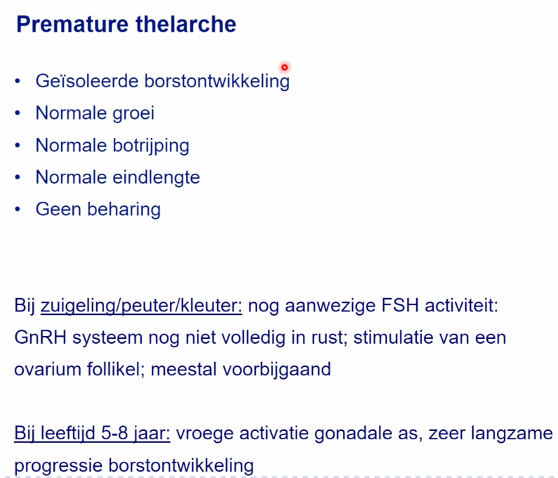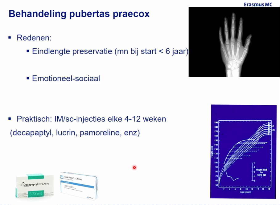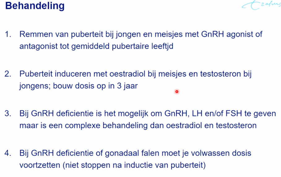 Behandeling: GNRH agonist (er bestaat geen antagonist), door dit continu te geven heb je geen gnrh pulsaliteit meer, waardoor er geen geslachtshormonen vrijkomen. Stoppen met behandeling bij een normale leeftijd voor start van de puberteit.