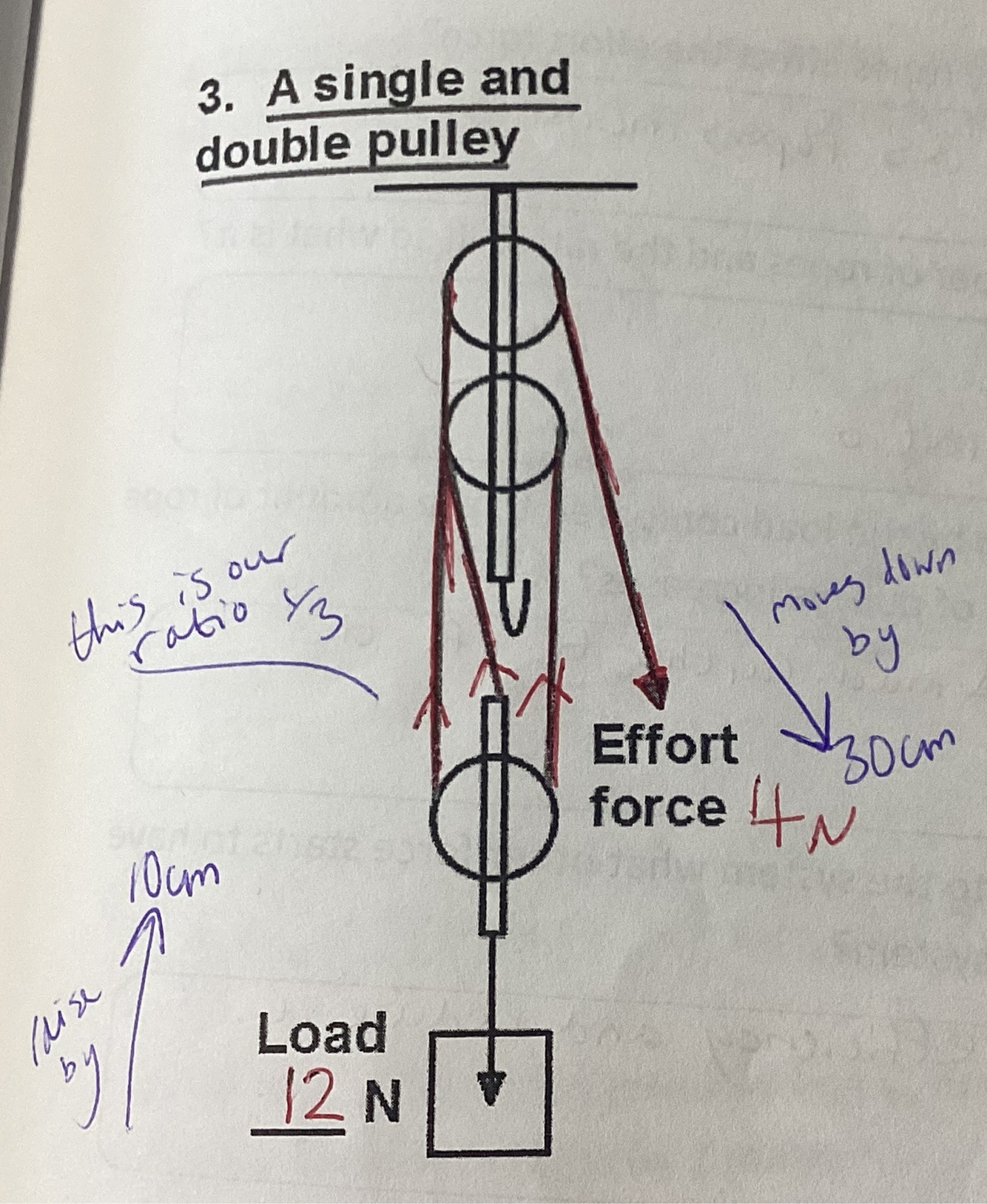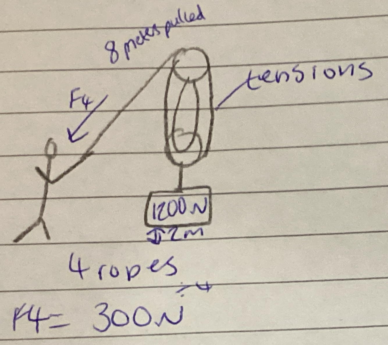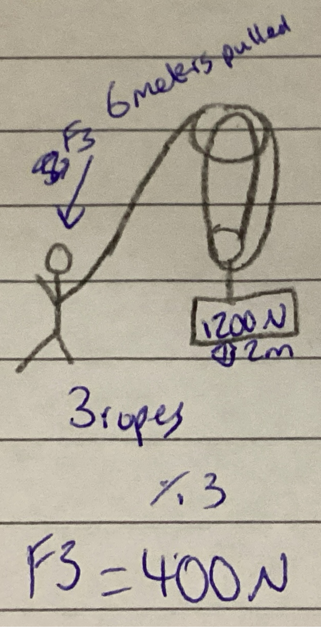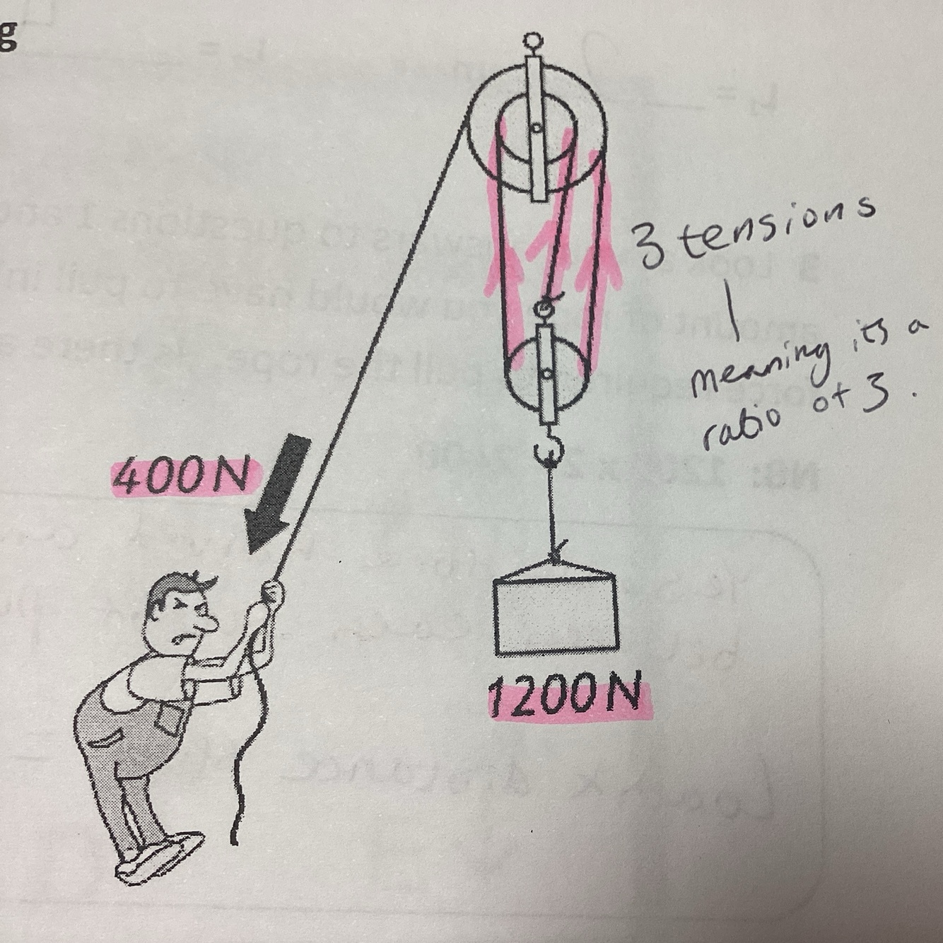 There are 3 parallel pieces of rope which support the load, therefore they each hold up one third of the weight. 1/3 of 1200N is 400N. This is the effort a person pulling the rope has to exert to hold up the 1200N weight, so their force is multiplied by 3.