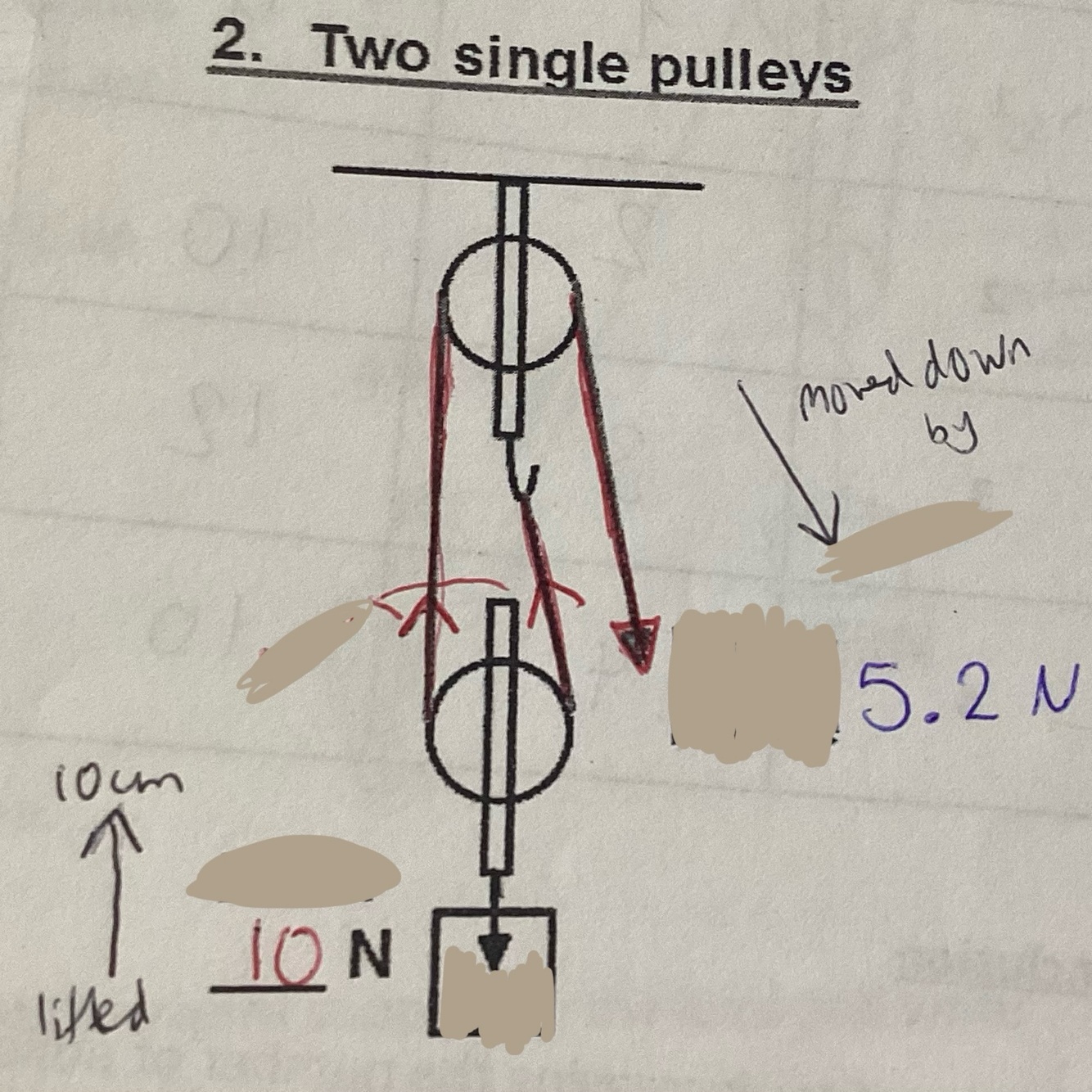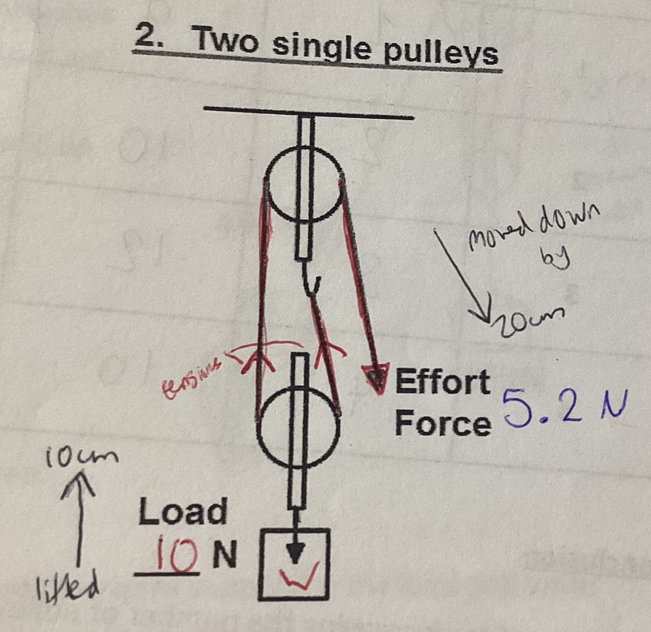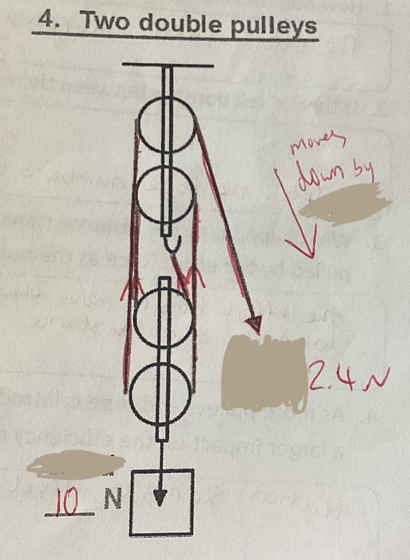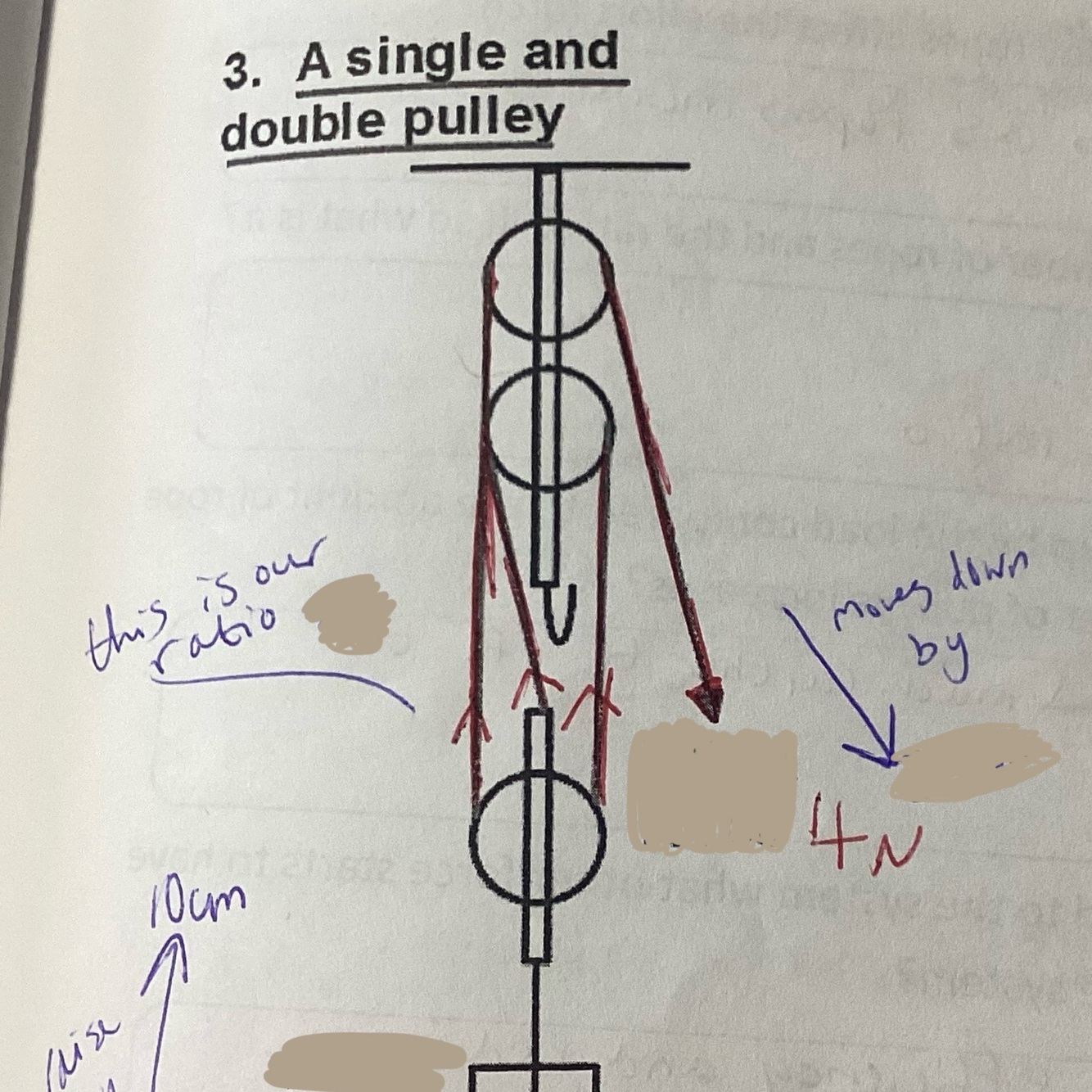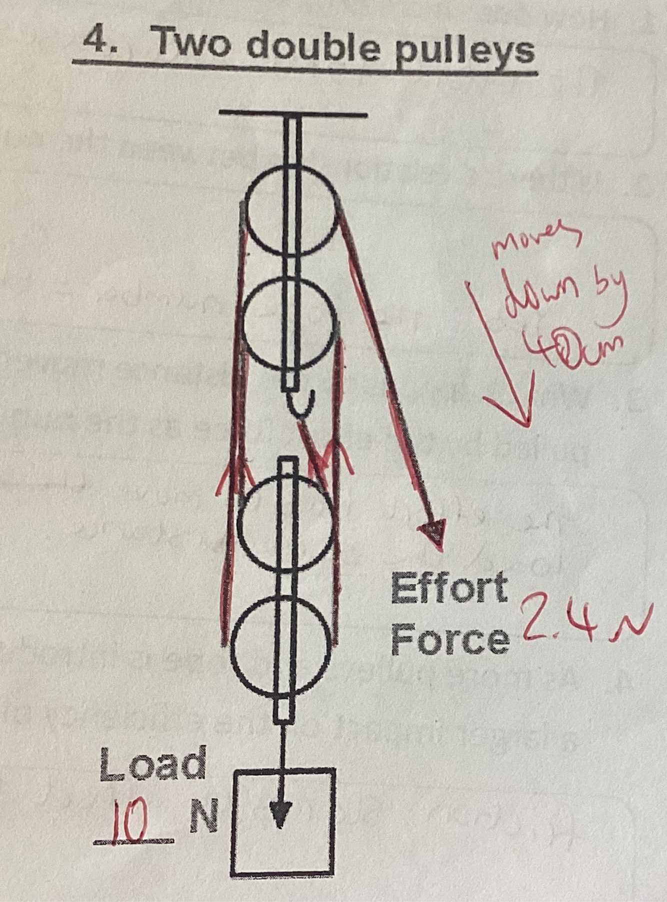 There are 3 parallel pieces of rope which support the load, therefore they each hold up one third of the weight. 1/3 of 1200N is 400N. This is the effort a person pulling the rope has to exert to hold up the 1200N weight, so their force is multiplied by 3.