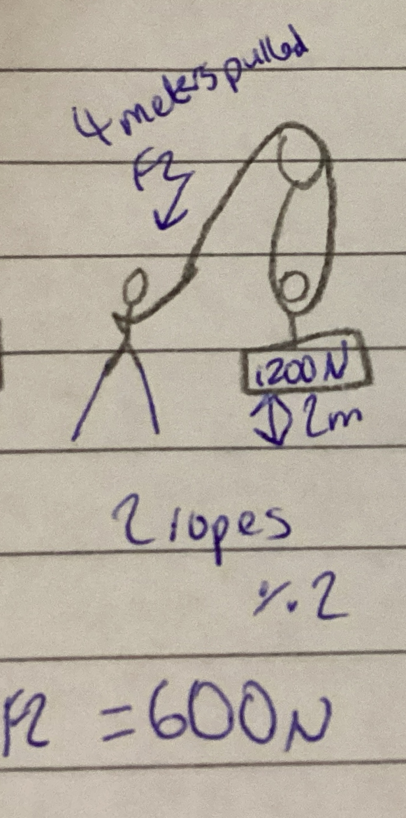If the load is 1200 newtons and there is one rope, what’s the force on the rope? And what’s the ratio?