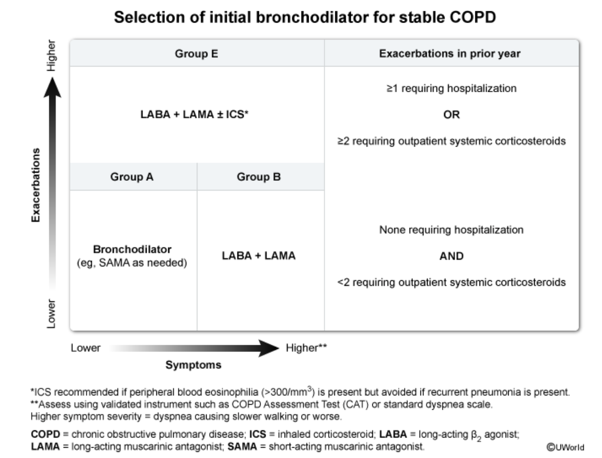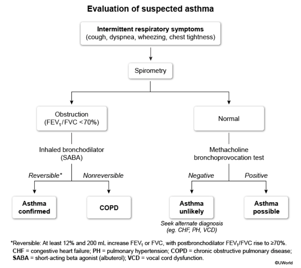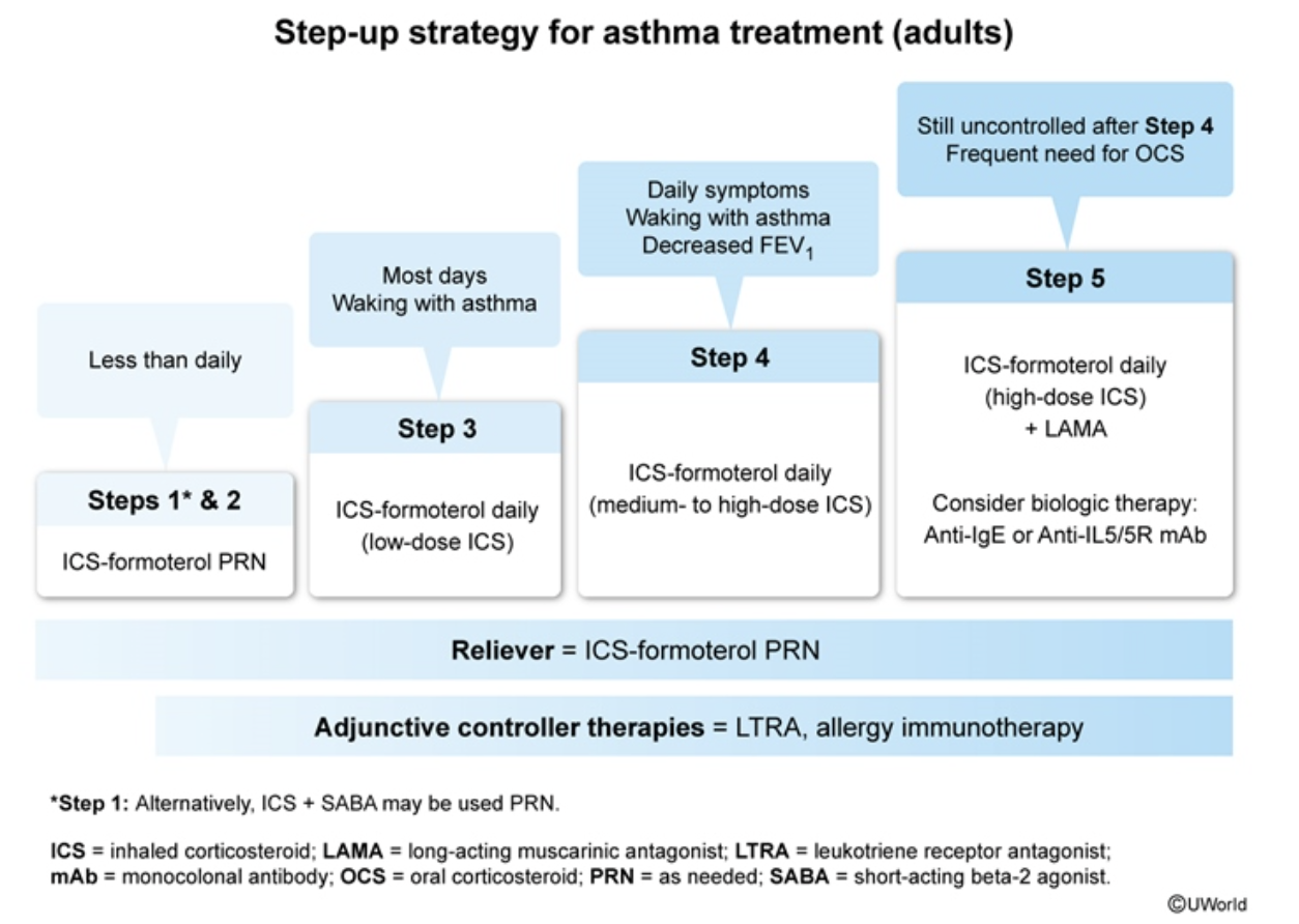 Asma persistente: se despiertan por la noche por el asma (cualquier día), uso de inhaladores de rescate la mayoría de días, VEF1 disminuido a pesar del uso de broncodilatadores (requieren ICS + formoterol por horario)