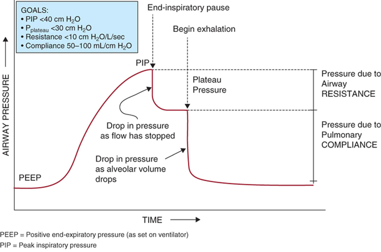 - La pausa crea una presión plateau que representa a la presión elástica (porque ya no hay flujo); si la presión plateau está elevada, indica una disminución de la compliance, y si está normal, indica un problema de aumento de resistencia de la VA