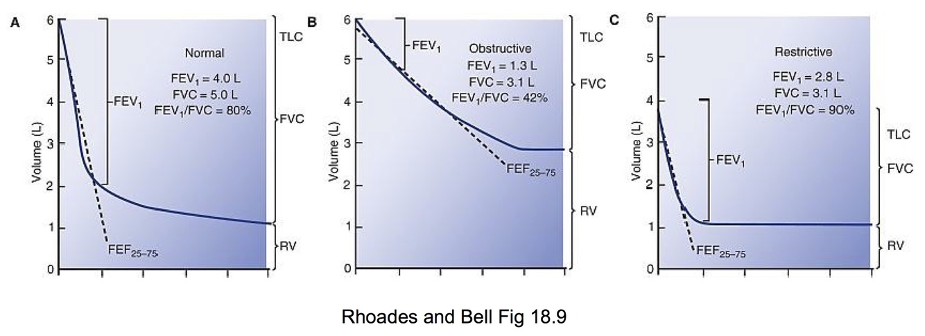 FEV1 / FVC = ratio of air expired over 1 second over the total ⇒ normal ~ 80%
