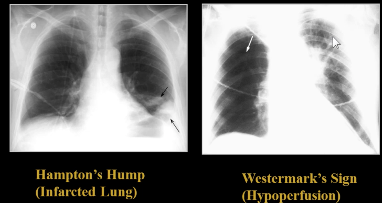 A couple findings that can sometimes be found are Hamptom’s Hump (showing infarcted area of lung) or Westermark’s sign (showing hypoperfusion of a lung–the lung is more translucent than usual)