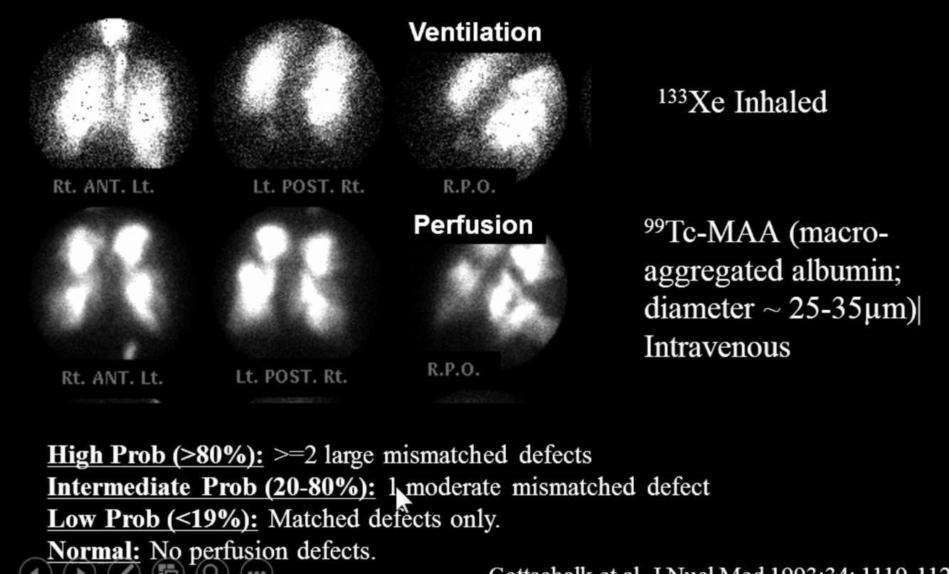 V/Q scan is a nuclear medicine scan that can visualize ventilation vs. perfusion. The patient inhales an agent while taking another through IV and the ventilation scans are compared with perfusion to see if they match. In a patient with PE, they will have mismatch defects that often look like wedges.