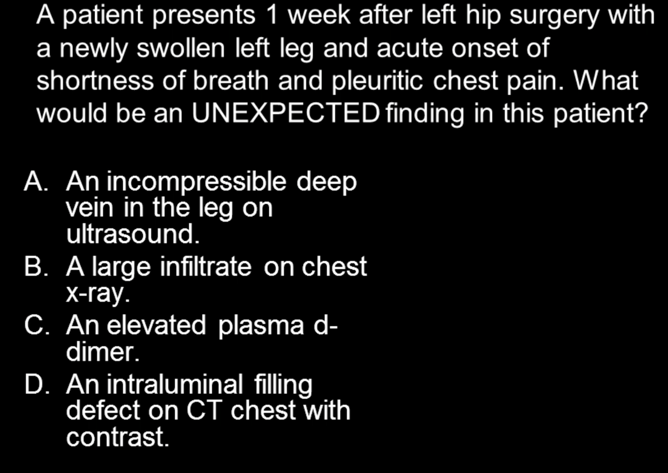 You would expect to find an incompressible deep vein in the leg on ultrasound, you would expect to find an elevated plasma d-dimer, and you would expect an intraluminal filling defect on CT chest with contrast. However, you would not expect anything in the lung fields.