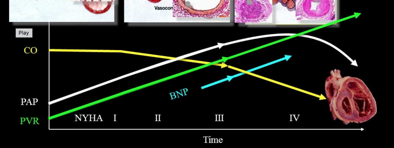 As pulmonary arterial hypertension progresses, the cardiac output starts to fail. Once the cardiac output fails, the pulmonary arterial pressure also falls because the heart is unable to overcome the increasing pulmonary vascular resistance. Also notice that there is a rise in BNP starting around NYHA 3 that is released during heart failure.