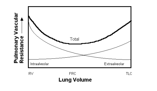 The total pulmonary vascular resistance is lowest at FRC; i.e. in the range of lung volume that we normally maintain.