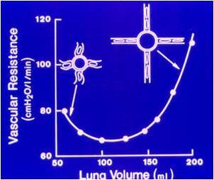 How does the total peripheral resistance/vascular resistance respond to increased lung volume (graph)?