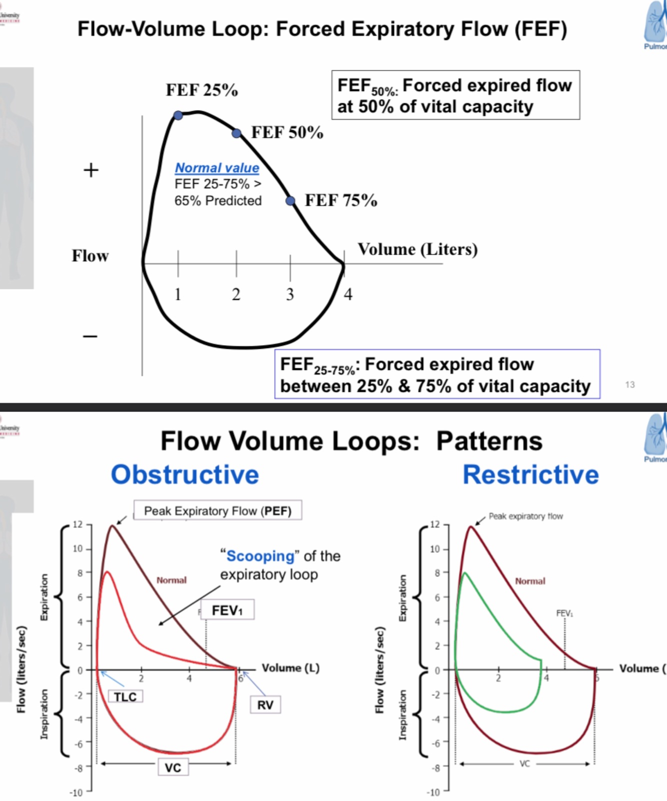 Describe a flow-volume loop in normal, restricted & obstructive respiratory ailments