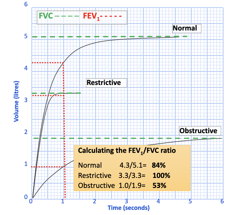 What is the expected normal, restrictive and obstructive FEV1/FVC ratio?