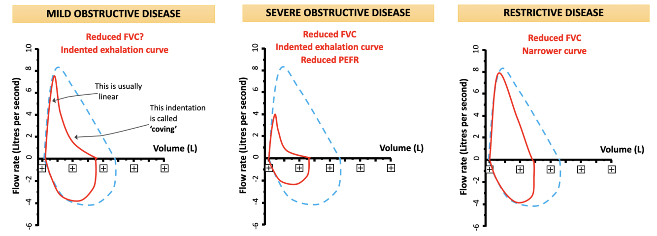 What do restrictive and obstructive diseases look like on an FVC chart?