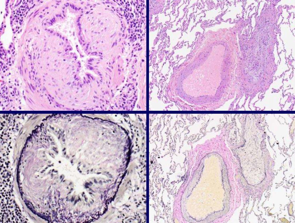 HISTOLOGY: org PNA has airspace filling fibroblastic plugs whereas ob bronch has submucosal scars