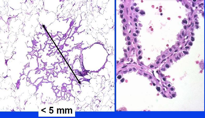 Localized proliferation of mild to moderately atypical cells lining involved alveoli and sometimes respiratory bronchiols and usually less than 5 mm in diameter.