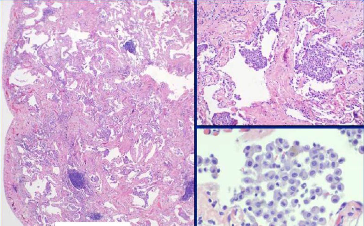 This lesion in the lung is seen more commonly in women with an average age in the 40s and shows papillary like projections lined by epithelioid cells with a central proliferation of polygonal mesenchymal appearing cells. Both populations are TTF1 positive indicating type II pneumocyte origin for this tumor.
