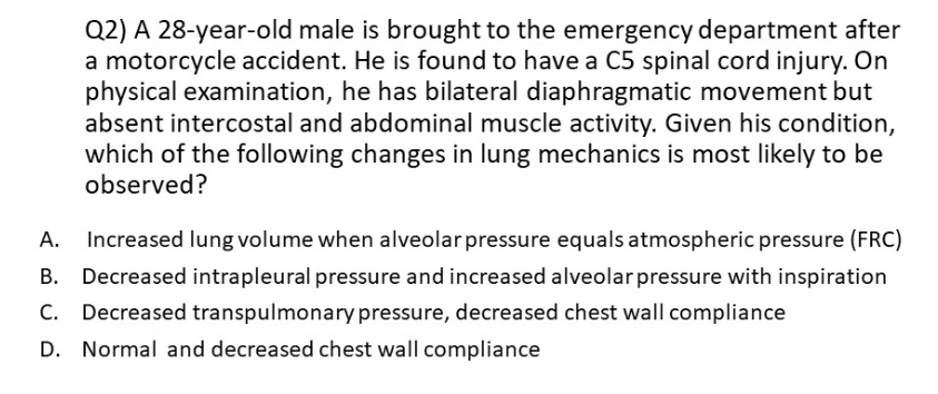 The correct answer is C, Pip = zero. A chest would will cause air to enter the intrapleural space and normalize the pressure with the atmosphere which we regard as zero. This will cause the Ptp and Palv to go to zero. The chestwall force expanding the lungs will be lost and the lungs will collapse. Without the negative pressure of Pip the chest wall will pull away from the lungs and the force it exerts on the lungs will decrease below normal.