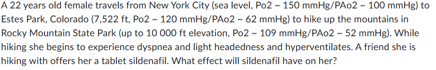 The hiker will need a Pao2 < 60 mmHg to maintain hyperventilation. The hyperventilation will drive off CO2 to less than normal which will cause blood alkalosis.