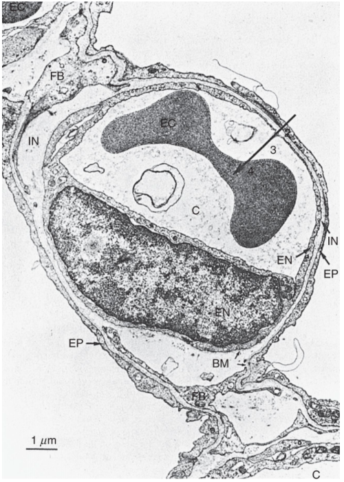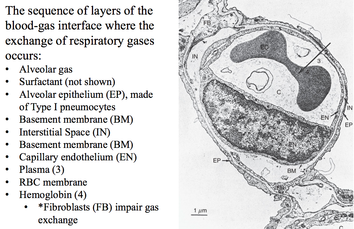 The thickness of the barrier between the alveolar air and hemoglobin in RBCs is