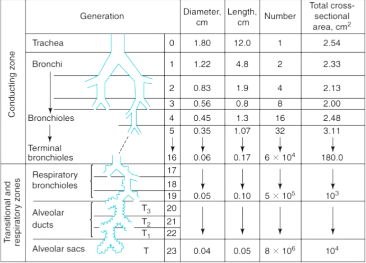 Total cross-sectional area increases so much that the forward velocity of the gas slows to a standstill at the alveoli –> gas diffusion takes over