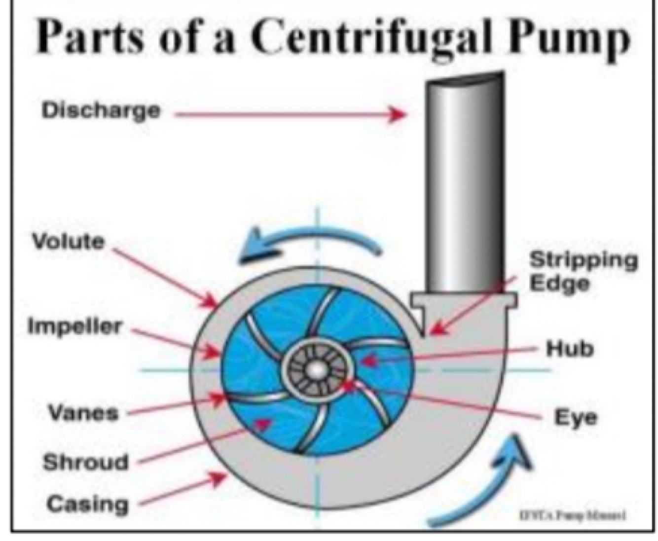 Fire apparatus pumps use centrifugal force to deliver water to the fireground. Centrifugal force is an outward force associated with rotation. The rotation in a fire apparatus pump is powered by the same transmission output shaft
