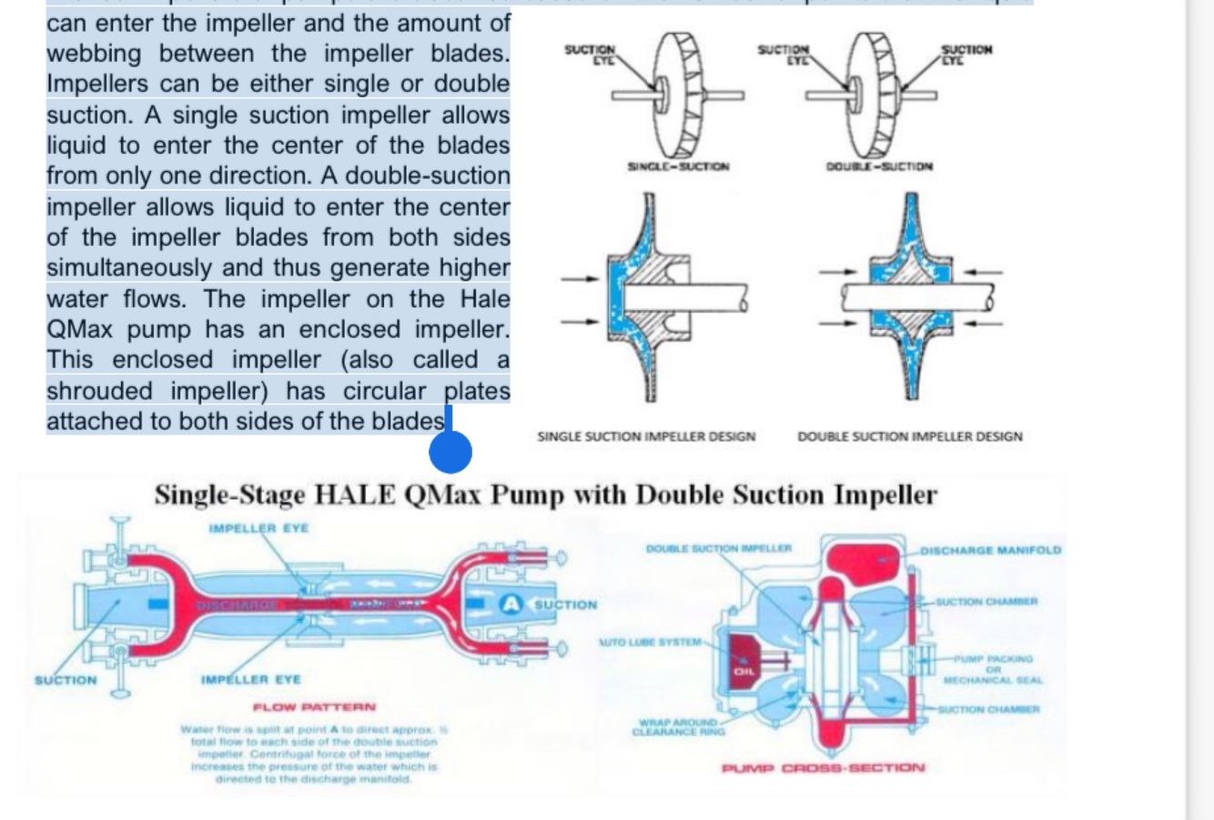 webbing between the impeller blades. Impellers can be either single or double suction. A single suction impeller allows liquid to enter the center of the blades from only one direction. A double-suction impeller allows liquid to enter the center of the impeller blades from both sides simultaneously and thus generate higher water flows. The impeller on the Hale QMax pump has an enclosed impeller. This enclosed impeller (also called a shrouded impeller) has circular plates attached to both sides of the blades.