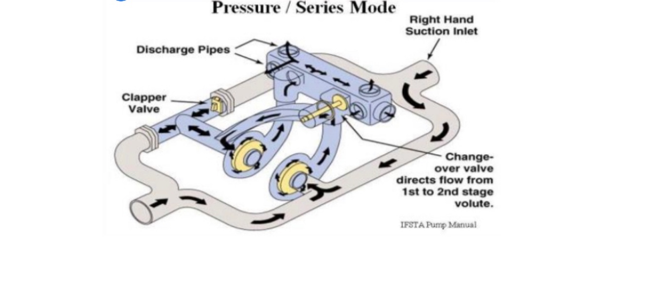 When the pump is in Pressure mode, a Transfer Valve located on the Engine Pump Panel closes clapper valves on one side of the intake piping, and one side of the discharge piping. These Clapper valves direct water into a “series” of two sequential volutes, hence this mode may also be referred to as Series. Water enters the first volute and gains pressure from the spinning impeller. This pressurized water exits the first impeller and enters the second volute where a second impeller further boosts the pressure before the water is routed to the discharge manifold. This mode is used where higher discharge pressures are needed due to friction loss, elevation loss, or other factors that mandate pressure over volume. Higher pump pressures do not equate to higher volumes of water. Pressure mode is not appropriate for pumping more than one-half of a pump’s