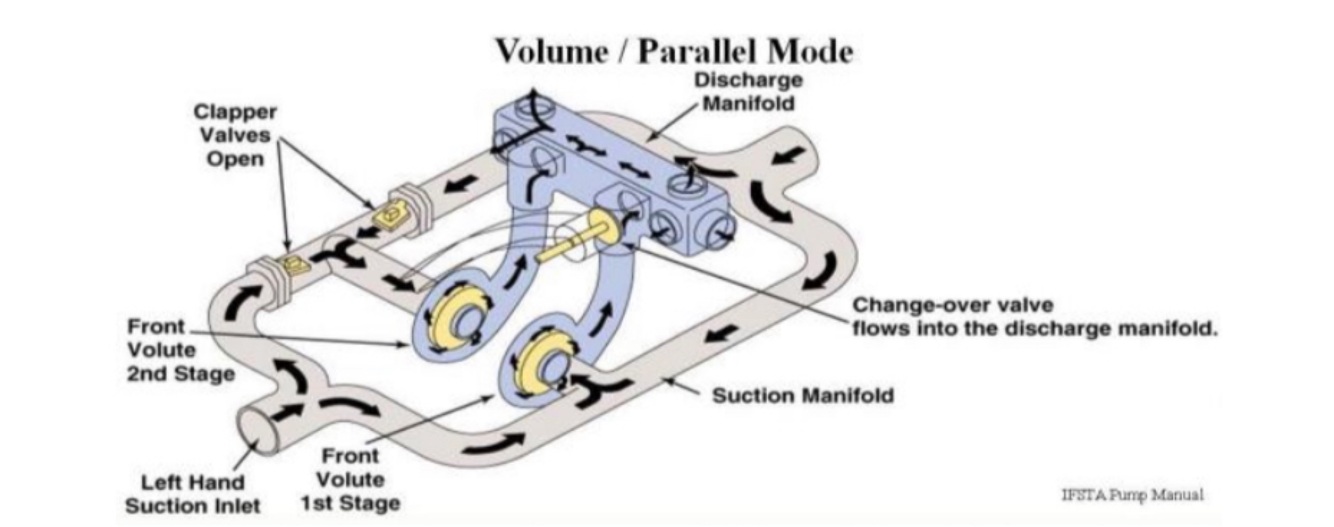 When the pump is in Volume mode, all the clapper and change- over valves are open and intake water is distributed evenly to both impellers at the same time. The two impellers are operating in parallel to each other to feed water to the discharge manifold, hence this mode may also be referred to as Parallel. Volume Mode delivers the maximum flow capacity available from a pump. This volume is provided at a cost of lower operating pressure. Volume Mode should be used when pumping more than one-half the rated capacity of a pump. It should be used during defensive operations (i.e., Master Streams) and when drafting.